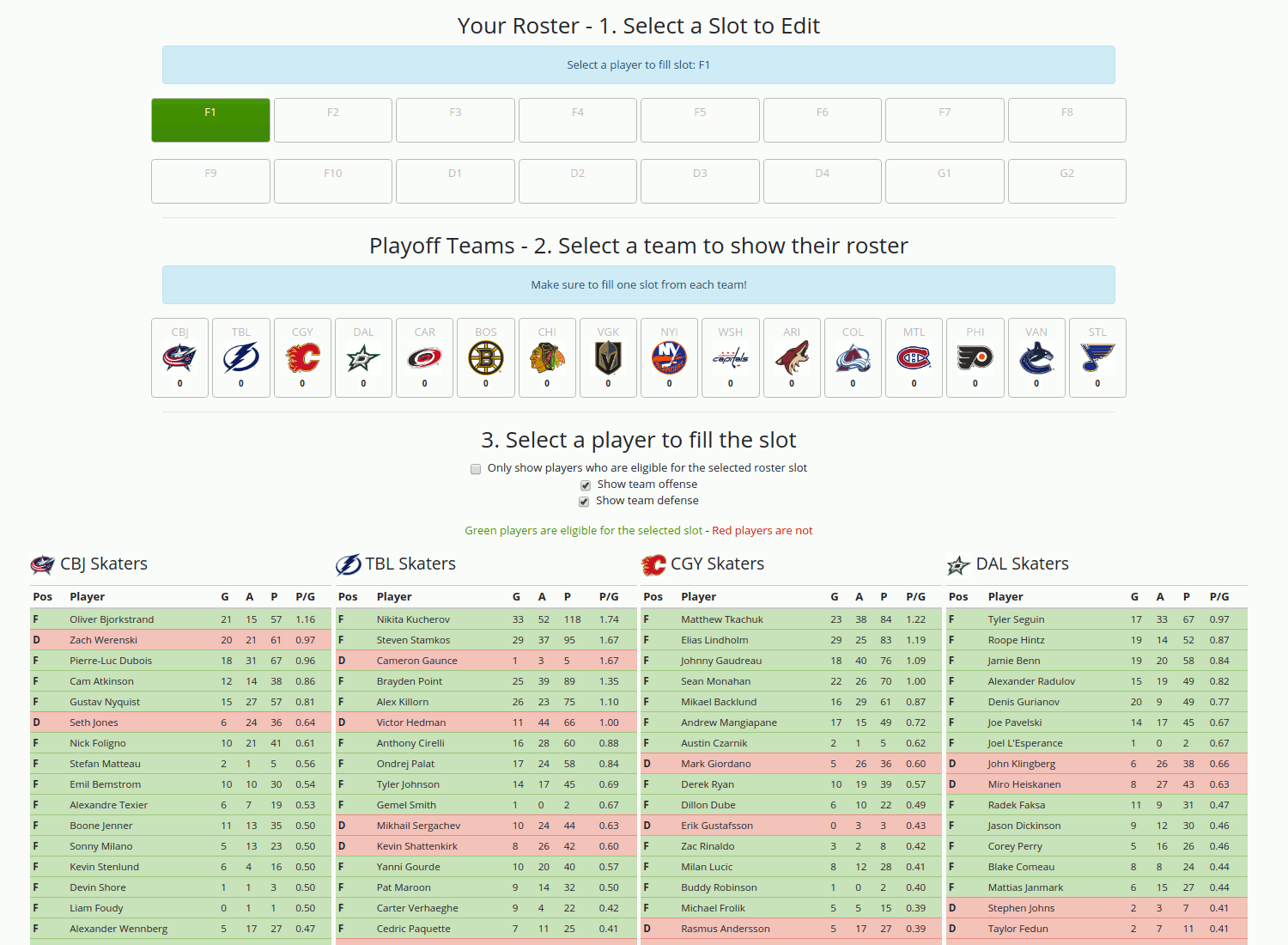 Creating your perfect roster has never been easier. The PlayoffPools TeamBuilder makes it easy to assemble your perfect team using a roster slot from each playoff team.