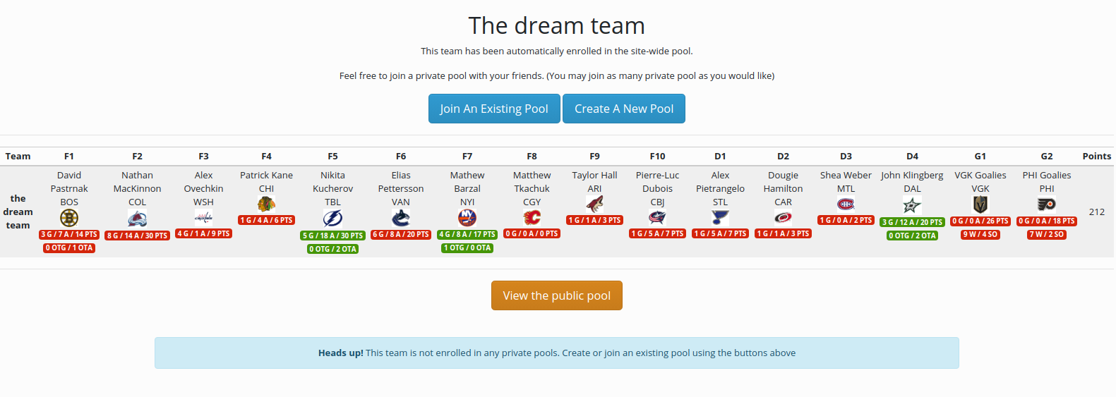 After creating your team you will be able to enter it into as many pools as you would like. Add a password to your pool if you would like to keep it private. All teams are automatically entered in the site-wide public pool.